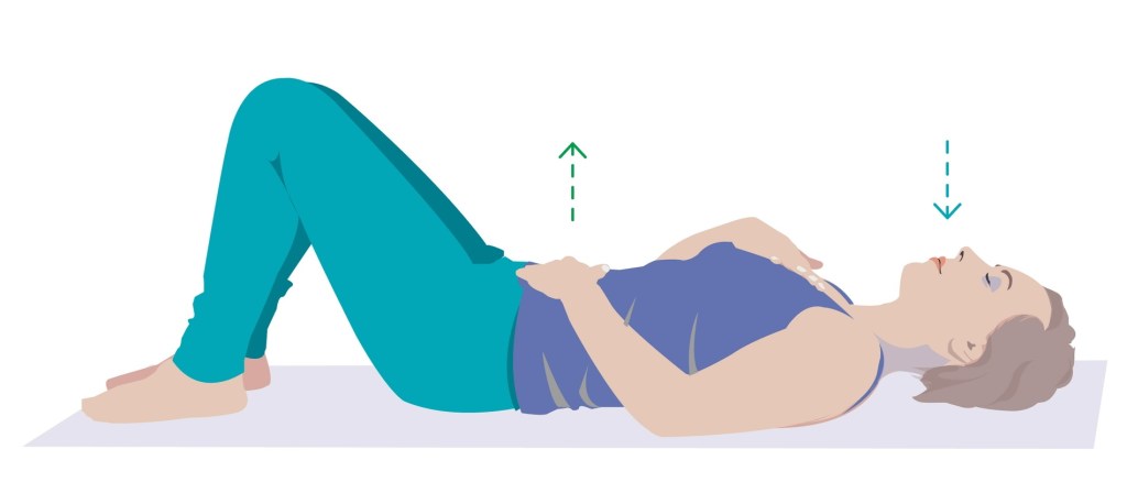 - Expirer doucement par la bouche (6-8 sec), laisser le ventre redescendre.