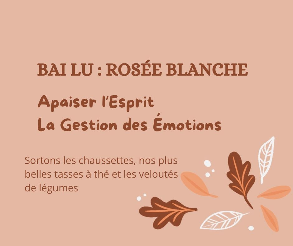 Alors que Bai Lu, la période de la « Rosée Blanche », nous invite à accueillir la fraîcheur naissante et à préparer notre corps pour l’automne, voici le nouveau livret : « Apaiser l’Esprit – Gestion des Émotions à Bai Lu ».