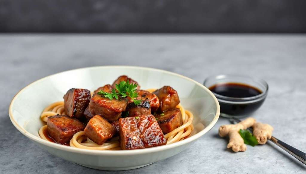 - Cocotte en fonte bien chaude : 2 c. à soupe d’huile → dorer l’agneau 12–15 min sur toutes les faces. Ajouter le reste de gingembre, poivre du Sichuan, bâton de cannelle, clous de girofle, noix de macadamia et 350 ml d’eau (ou bouillon d’os). Couvrir, baisser à feu très doux 45 min. Découvrir les 10 dernières minutes pour faire réduire et glacer la sauce.